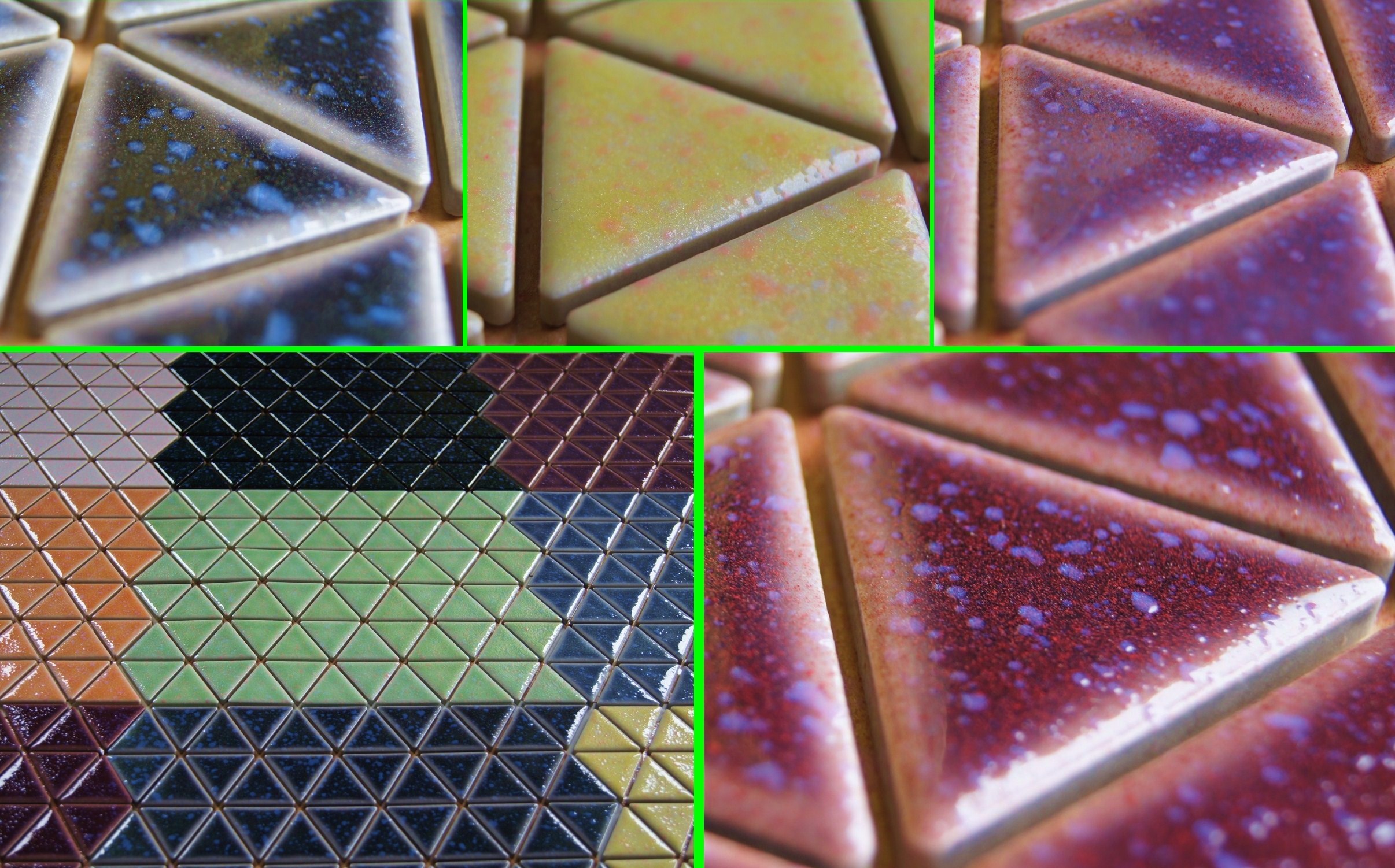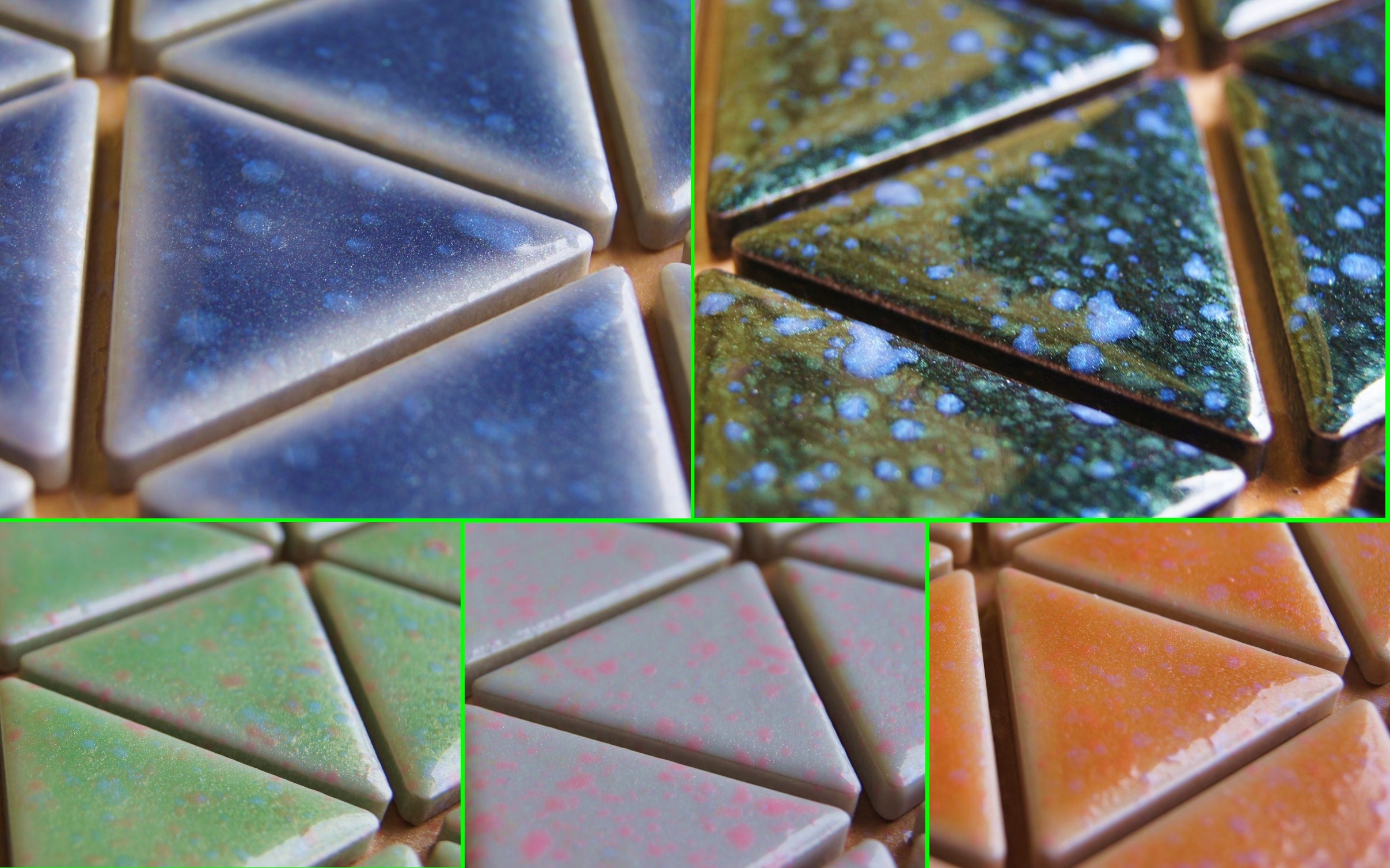 画像は試作用で45角ですが、これを三角のタイルに施釉して焼成して、更に塗料で加工します。