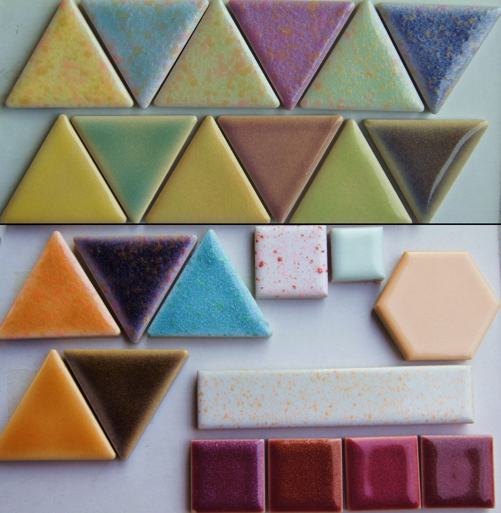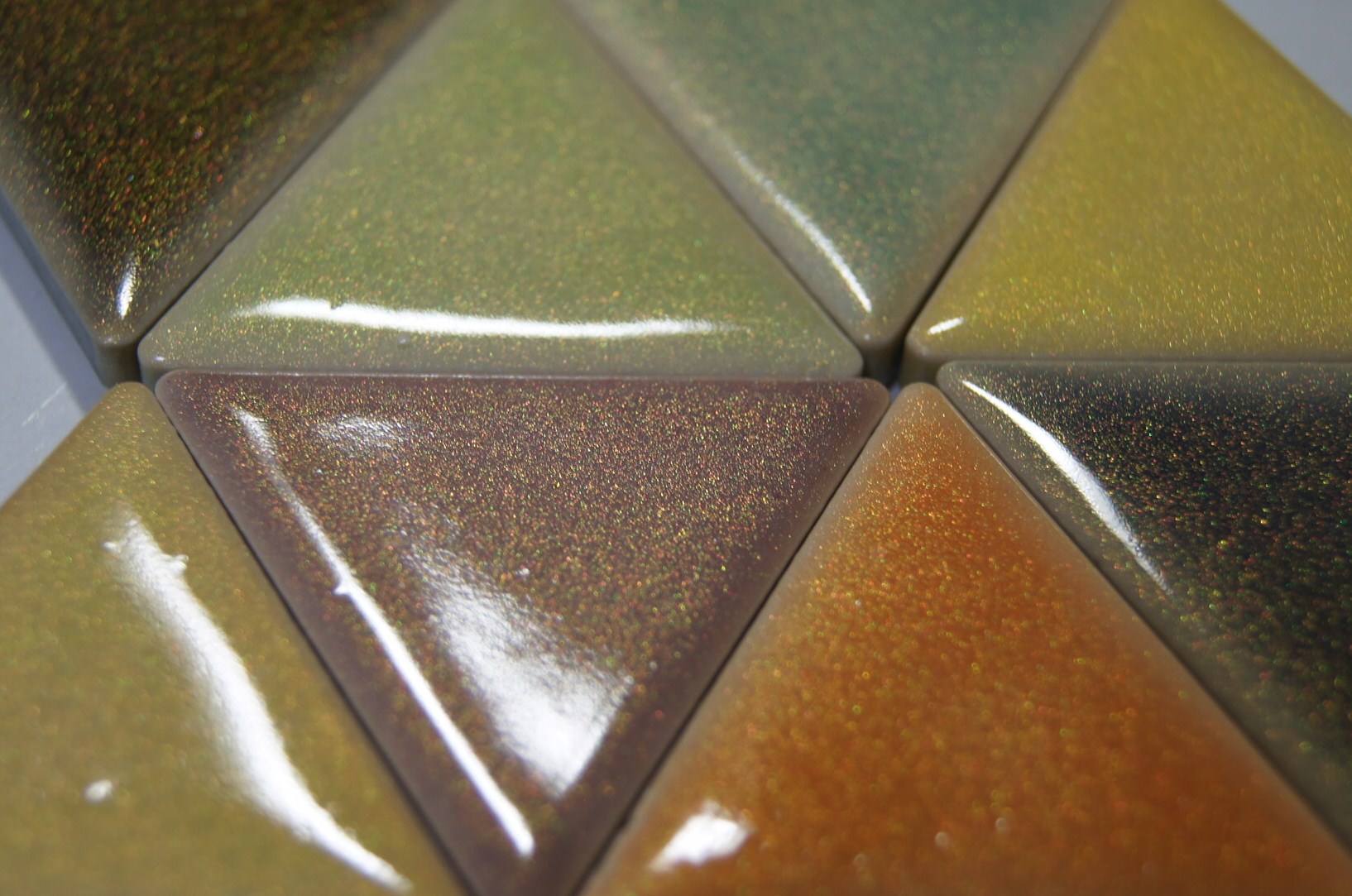 こちらも生産品。色指定の対応できます。正三角形の単色のプレーン(白と黒は単色)ではなく、1層目に色釉を施し、2層目に透明釉を施して奥行きのある表情になるよう工夫されたタイルです。