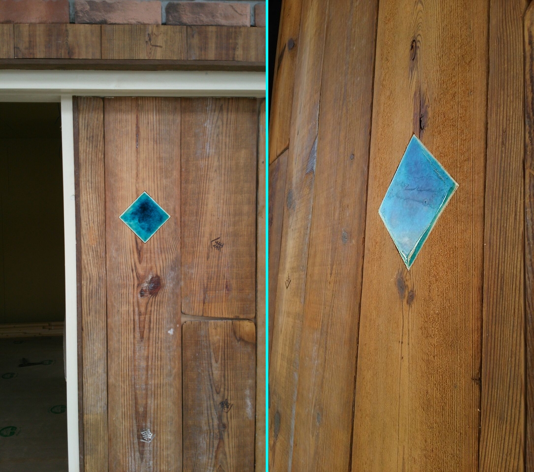 モザイクタイルミュージアムの近くの改装中の店舗の壁に、以前デザイナーさんからのご依頼でオーダーでつくった「マリンタイル」を埋め込みました。