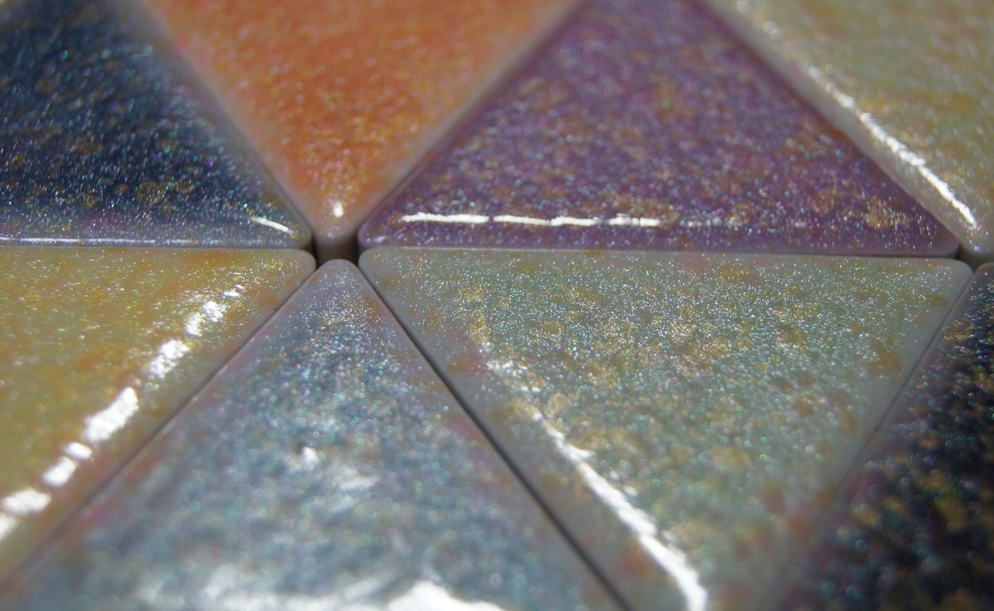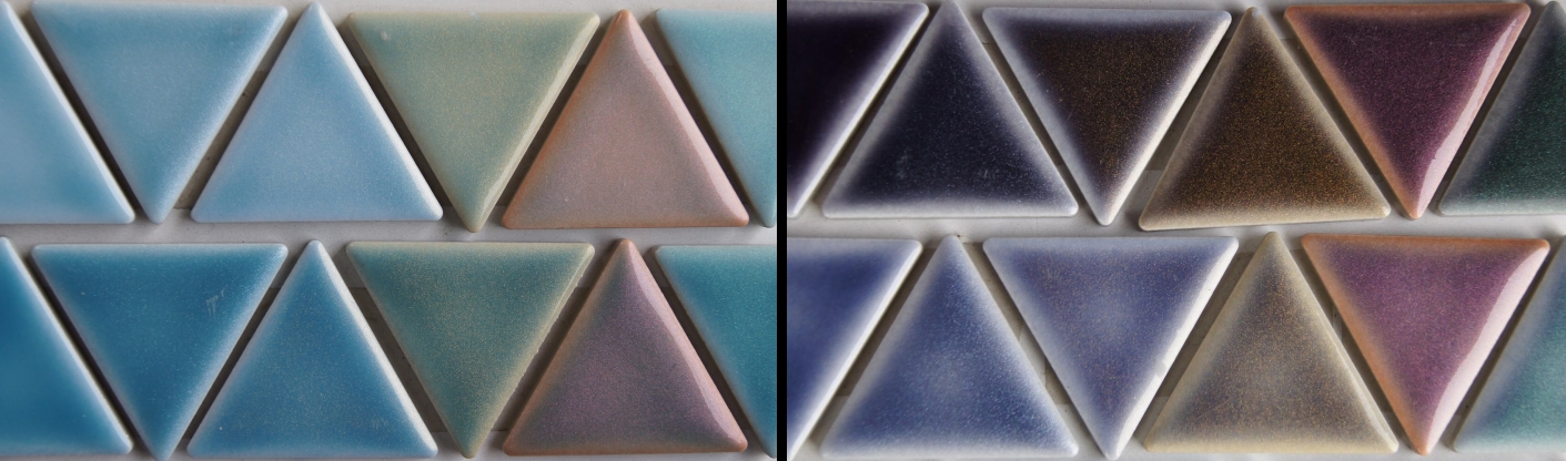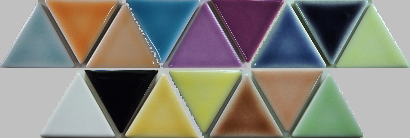 こちらも生産品。色指定の対応できます。正三角形の単色のプレーン(白と黒は単色)ではなく、1層目に色釉を施し、2層目に透明釉を施して奥行きのある表情になるよう工夫されたタイルです。
